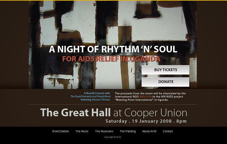Designed and launched in 24 hours, this event poster site was developed for a Jazz benefit concert for AIDS relief in Uganda, and generated a 20% increase in donations.